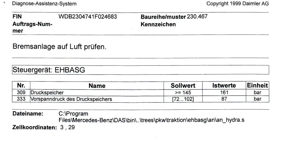 Teil 1: R230 Bremse Teil 2: SBC-(Sensotronic Brake Control)-Bremse Teil 3: Diagnose/Wartung/Deaktivieren Teil 4: Prüfroutinen Diagnose: |