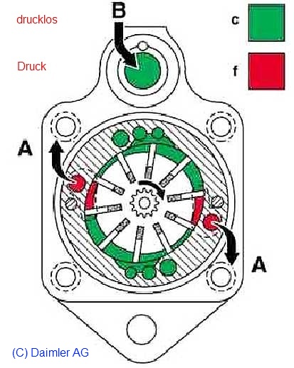 Beim Weg eines Kolbens im Kolbenraum nach unten entsteht ein Unterdruck, der das Öl durch eine Bohrung im Kolben ansaugt. Kurz nach dem unteren Totpunkt wird die Ansaugbohrung im Kolben verschlossen. Das Öl wird nun über ein Druckumsteuerventil gegen den Betriebsdruck ins System gefördert. Nach dem oberen Totpunkt schließt das Druckumsteuerventil, da der Druck der Feder höher als der Öldruck im Kolbenraum ist. Bei 1500 U/min und vollständig geöffnetem Saugdrosselventil beträgt die maximale Fördermenge ca. 10,5 Liter/Min.. Bei geschlossener Saugdrossel ergibt sich nur noch 1 Liter/Min.. Durchschnittlich werden im Normalbetrieb etwa 2 Liter/Min. benötigt, siehe Literatur (1). |