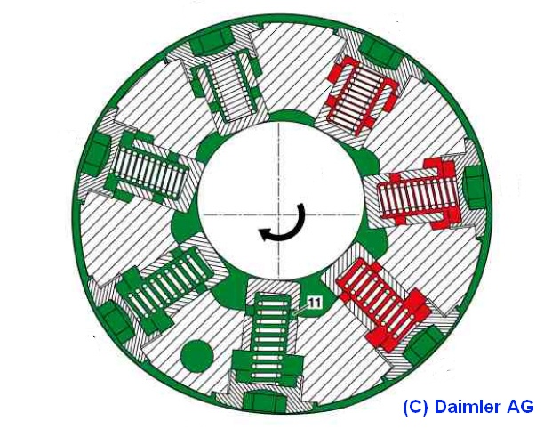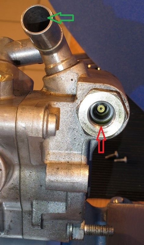 Aufbau: GF46.30-P-330003A Der vordere Teil der Tandem-Pumpe (LFR430), die Radialkolbenpumpe, erzeugt den Druck fürs ABC-System. Roter Pfeil: Saugschlauch vom unteren Anschluss am Vorratsbehälter ABC. Die Pumpe besitzt 7 radial bewegliche, federbelastete Kolben, die über einen Exzenter auf der Antriebswelle bewegt werden. Grüner Pfeil: Zulaufleitung Vorratsbehälter Lenkhilfe. |