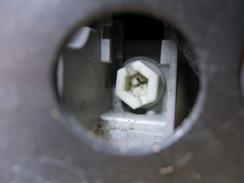 "Von oben geht durch das Scheinwerfergehäuse die Einstellschraube (aus Kunststoff schwarz). Die dient zur Höhenverstellung. Durch Drehung wird das Kegelrad (schwarz unten im Bild) verdreht. Die schwarze Kunststoffschraube vorn mit Kugelkopf ist im Reflektor fest eingerastet und hinten im Schiebestück (weißes Bauteil unten im Bild) der LWR eingeschraubt. Wird nun oben gedreht, verstellt sich der Abstand des Reflektors zum Stellmotor. Der Stellmotor wiederum kann den Abstand geschätzt um plus/minus 2,5 mm variieren." |
