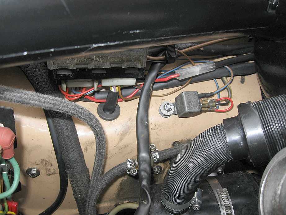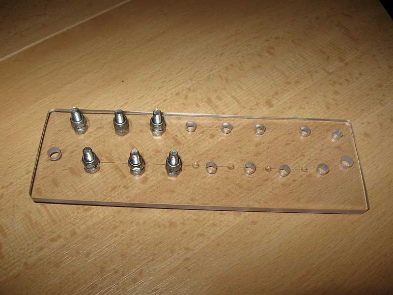 Zwölf M5-Schrauben dienen als Stehbolzen, um die Kabel mit Ringösen (gecrimpt und verlötet) anzuschrauben. Die Platte passte im linken vorderen Kotflügel außen am Radlaufblech zum Motorraum unterhalb des oben im Motorraum befestigten Steuergerätes. Dadurch konnte der originale Kabelbaum um über 50 cm gekürzt werden. Er führt von der Verteilerplatte durch eine Kabeldurchführung (2,2 cm) direkt zum Steuergerät. |