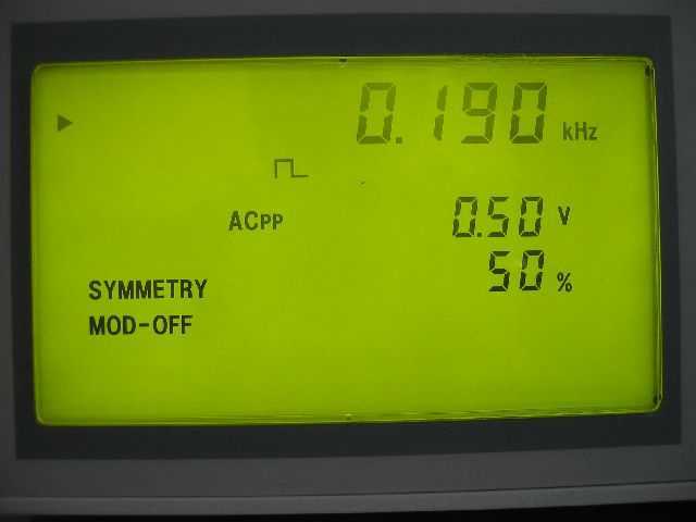 den Funktionsgenerator: Frequenz ca. 190 Hz, etwa 500 mV, Rechteck