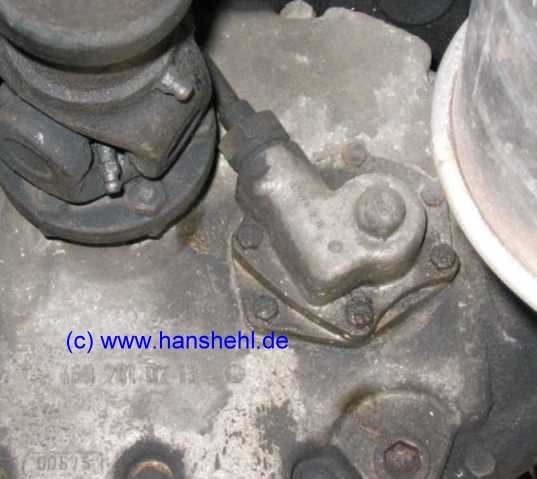 Der alte mechanische VDO-Tacho hat den Wert W = 1,0 (1000 Umdrehungen pro km, Prägung außen am Tacho). Der neue Impulsgeber liefert pro Umdrehung 6 Impulse, d.h. 6000 Impulse für 1 km. Die Reifen entsprechen der Originalbereifung. Die Hinterachse hat die Achsübersetzung I = 5,286. Ein Winkelgetriebe für den 240GD hat z.B. die Kennziffer 2, A460 280 0429 und hat den Wert 0,462. Mein Winkelgetriebe hat die Nr. A4602810030 und ist nicht mehr lieferbar. alte Reifen: Bei 432,53 Radumdrehungen für einen Kilometer und einer Achsübersetzung von I = 5,286 ergeben sich 2286,35 Umdrehungen der Kardanwelle. Das Winkelgetriebe mit dem Faktor 0,462 ergibt dann 1056,3 Umdrehungen der Tachowelle. Das wären dann etwa 6337 Impulse. neue Reifen Neue DMZ2 haben mit 10 mm Profil 2,354 m Umfang. Es ergeben sich 1000 m / 2,354 m = 424,81 Radumdrehungen * 5,286 = 2245,54 Kardanwellen-Umdrehungen * 0,462 = 1037,44 Tachowellen-Umdrehungen, also etwa 6223 Impulse rechnerisch. Mit diesen neuen Winterreifen ergab sich bei eingestellten 6000 Tachoimpulsen eine Tachoanzeige von etwas über 50 km/h, wobei eine mobile Radarstation am Ortsrand 52 km/h anzeigte. Fazit: Am besten mal die Impulszahl eingeben, die dem alten Tacho (W=1,0) entspricht (am Tacho außen eingeprägt). Beim alten Impulsgeber mit der Kennzahl 6 also 6000 Impulse eingeben und dann messen. Weitere Einstellmöglichkeiten finden sich in der Anleitung zur Justierung des Tachos. 9. Änderung der Reifengröße: Kein neues Winkelgetriebe: