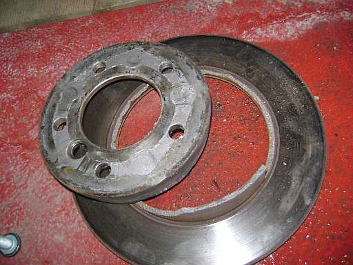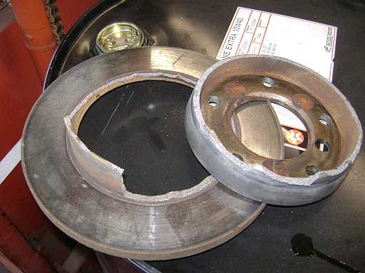 Bei einem G55AMG-Sauger kurz brach die hintere Bremsscheibe von der Bremstrommel der Feststellbremse (Bilder vom Stefan, Danke!). Ursache war unbekannt. Bremsscheiben brechen vom Nabentopf bei nicht ebener Bremsscheiben-Auflagefläche der Nabe. |