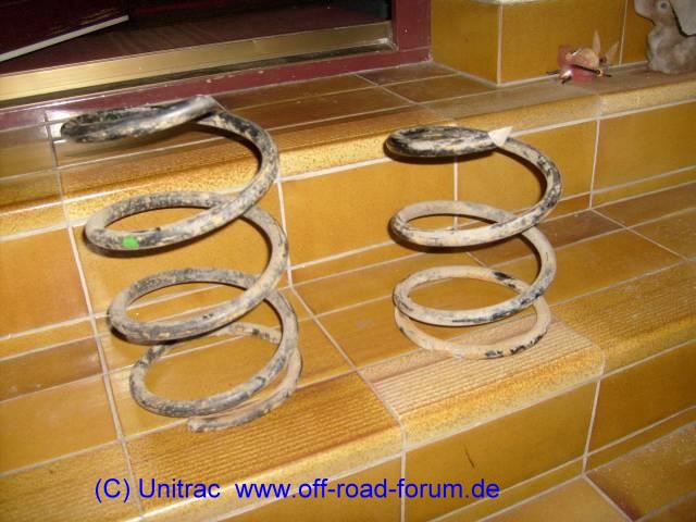 Beim G brechen meistens die Hinterachsfedern mit der Kennung grün, wobei eine oder beide Windungen am Federrand brechen (1.Bild). Bricht die Feder dagegen in der Mitte, schlitzt es den neuen Winterreifen auf, wie es "Unitrac" ( www.off-road-forum.de ) passierte. Aus- und Einbau der Federn beim G: Tipp10 |