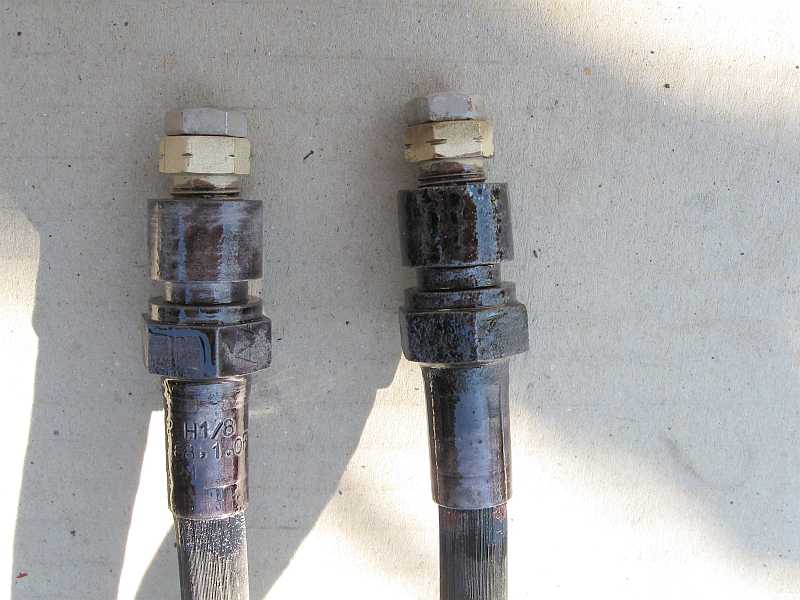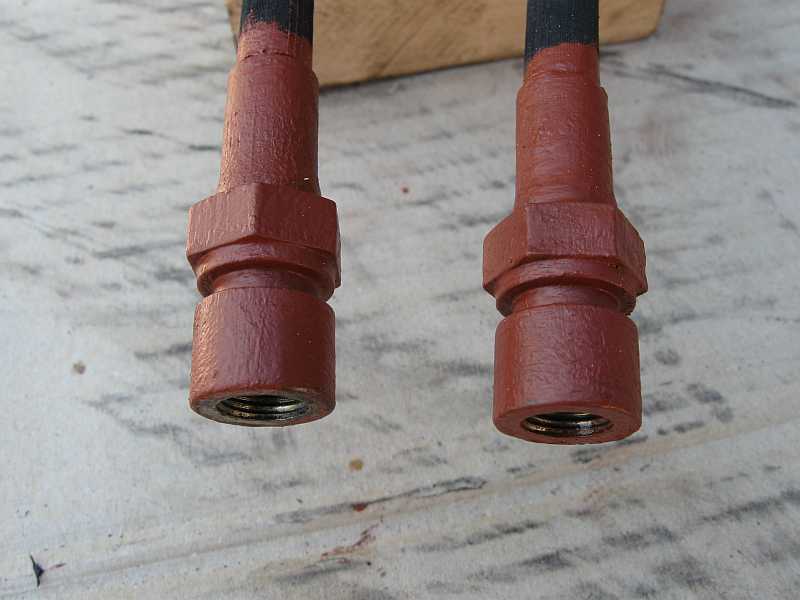 Die Bremsschläuche der Vorderachse sind nicht rissig und noch gut. Die auf beiden Seiten gleichen Anschlüsse (Innengewinde M10x1) werden mit selbstgebauten Einsätzen verschlossen und sandgestrahlt, chemisch entrostet und grundiert. siehe auch Rund um die Bremse. |