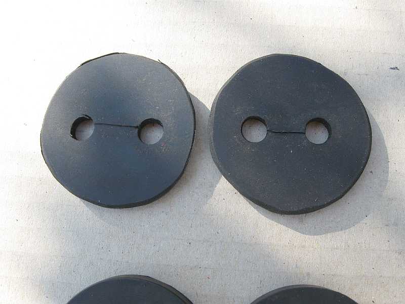Auch die Abstandshalter der Bremsschläuche kann man aus 5 mm dickem Weichgummi selber anfertigen. Ein 50 mm Henkel-Stanzeisen kostete über 40 Euro, lohnte sich also nicht. Ich schneide die Scheiben mit der Schere aus und runde die doch etwas eckigen Scheiben mit einer Fächerschleifscheibe in einer kleinen Flex. Mit einem kleinen 8mm Stanzeisen werden die zwei Löcher für die beiden Leitungen gemacht, mit einem breiten Stemmeisen dann der Schlitz. zur Restauration 2014 Teil 3 |