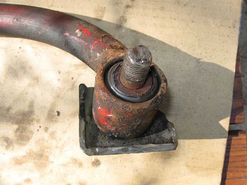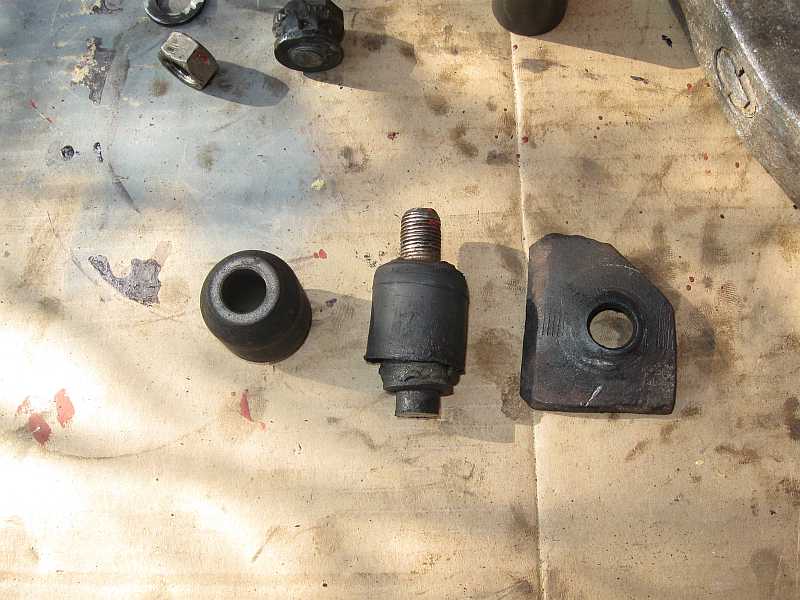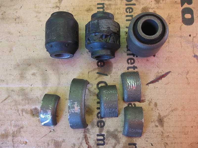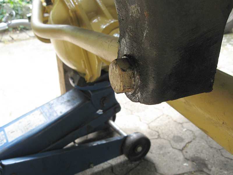 | Also das vordere Halteblech an an den Seiten abflexen, der Panhardstab ist ausgebaut. Selbst mit einer 20 to-Presse gelingt es nicht den Schraubenstumpf aus der Gummilager-Buchse zu pressen. | ![]() |