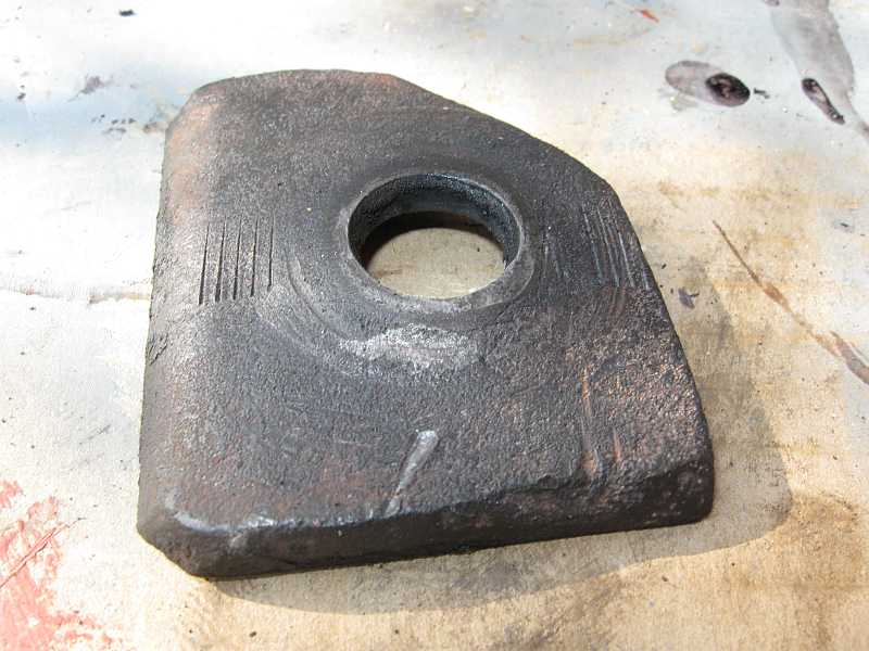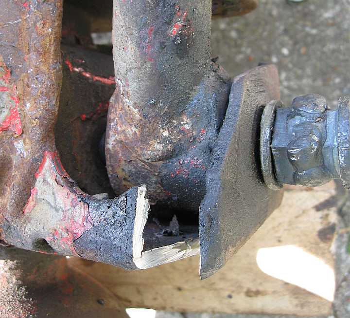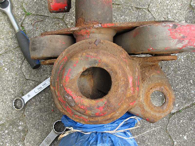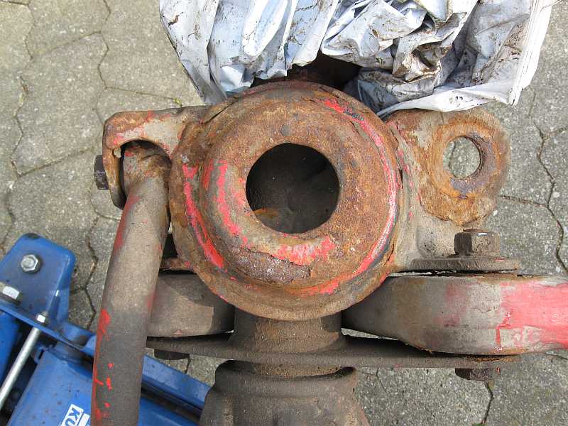 | Das abgetrennte und verbogene Teil wird gerichtet, abgeschrägt und mit neuer Buchse und Schraube an der Achse fixiert und angeschweißt. | ![]() |