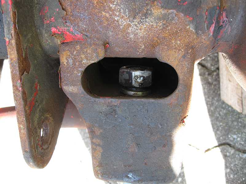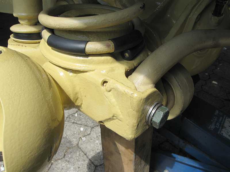 2005 hatte ich schon das Problem der in der Gummilagerbuchse des Panhardstabs festgerosteten Schraube gehabt. Bei der Restauration anfangs April 2014 ist es das gleiche Problem. 2005 verwendete ich zum Glück eine V2A-Mutter M16x1,5. |