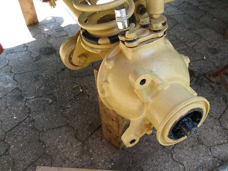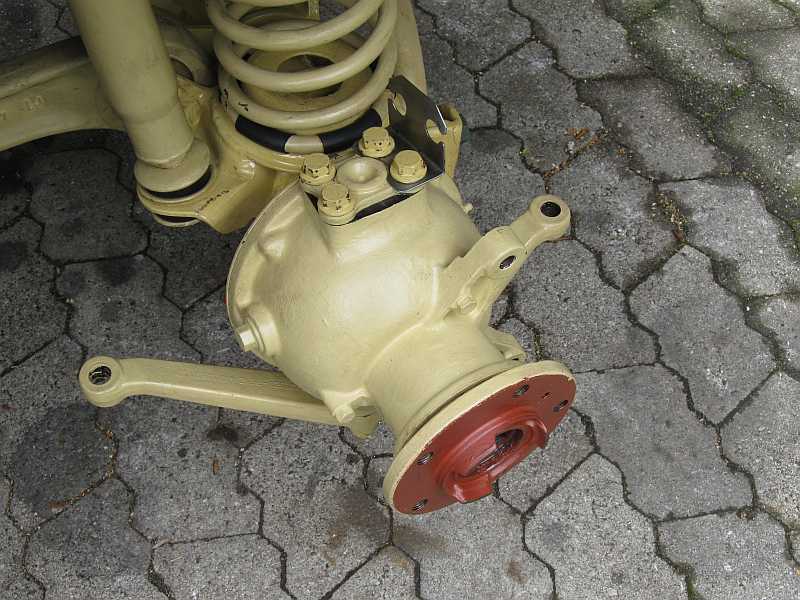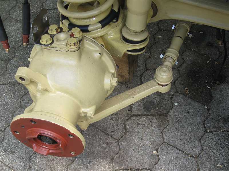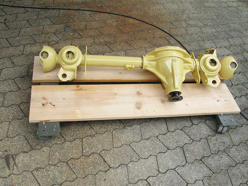 Nach dem Einschieben der Steckachsen werden die Achsgehäuse mit den Achsschenkeln/Lagern) aufgesetzt und Lenkstockhebel (Achse rechts) und Spurstockhebel (Achse links) angeschraubt. Drehmomente der Schrauben beim 240GD (10/1979) siehe hier. |