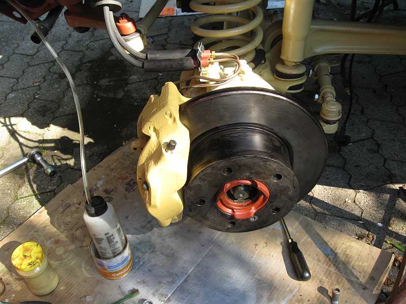 Ende der 2. Juli-Woche 2014 sind die Bremssättel angeschraubt und die Bremsklötze mit neuen Halteblechen und Stiften eingebaut. Die Bremsen sind schon mit Eezi-Bleed entlüftet und die Räder anmontiert..