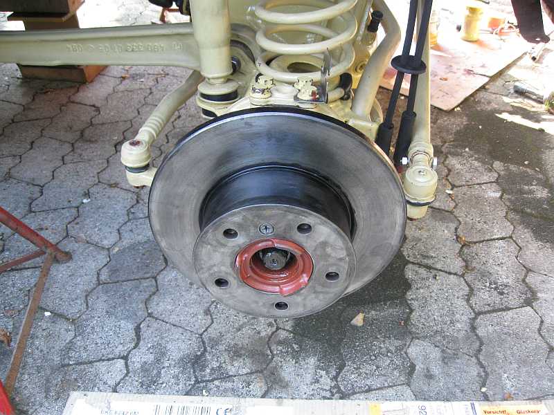 | Die entrosteten Bremsscheiben sind im Topf mit Brunox konserviert und hauchdünn gefettet. Da sie nach dem Einbau noch längere Zeit nicht benützt werden, werden die Bremsscheiben beidseitig mit dem Konservierungsspray von Würth eingesprüht. Der Film kann dann abgebremst werden. | ![]() |
