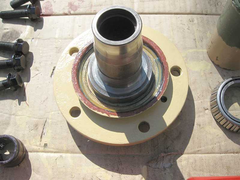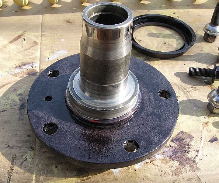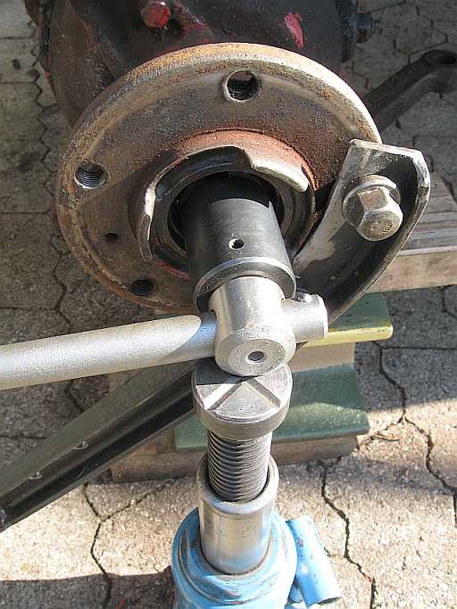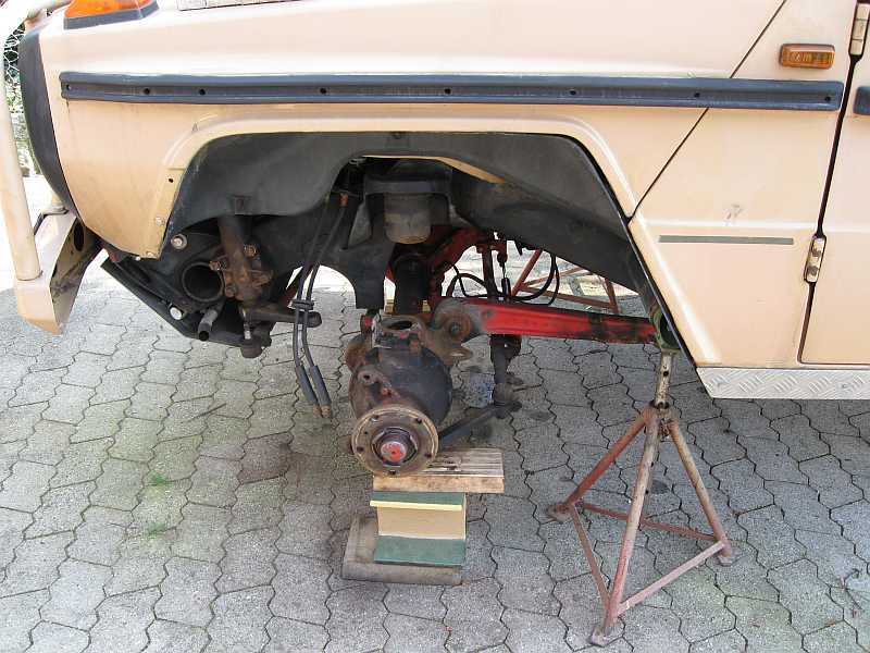 Nach Lösen der beiden Radnabenmuttern kann die Radnabe herausgezogen werden. Das Radlager wird mit dem Abzieher abgezogen und die verrosteten Bereiche der Radnabe werden sandgestrahlt, siehe die Berichte( 280GE und 240GD). |