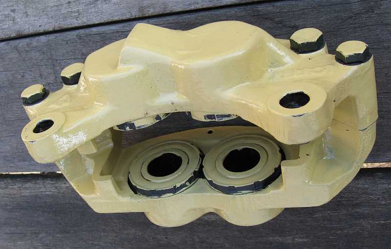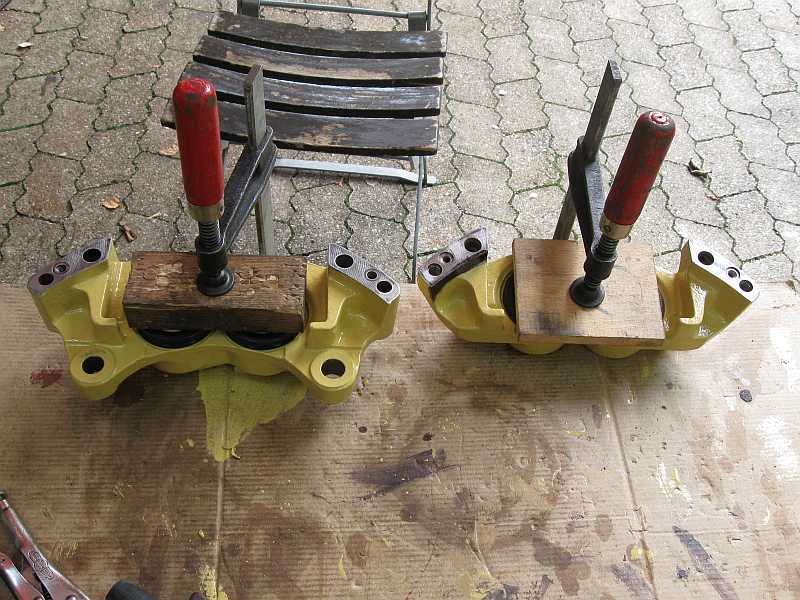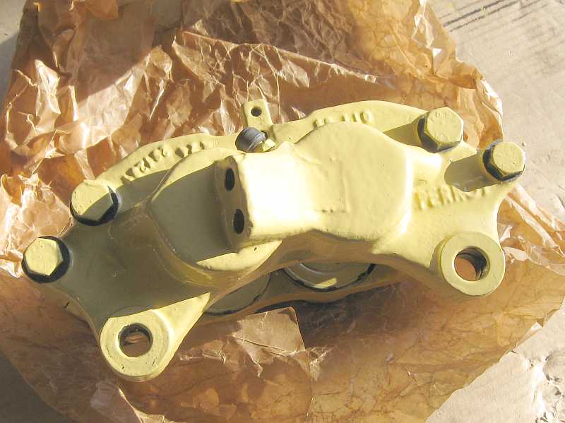 Ein 2009 aufbereiteter Bremssattel (tipp98-3.htm#b15) war tannengrün lackiert. Er diente als Reserve und erhielt nun eine andere Farbe mit hitzebeständigem sandgelben Urethanlack. |