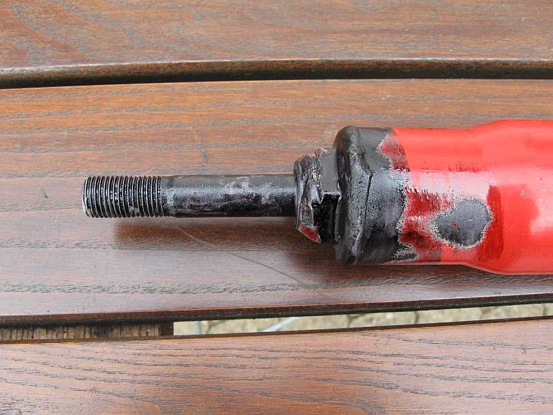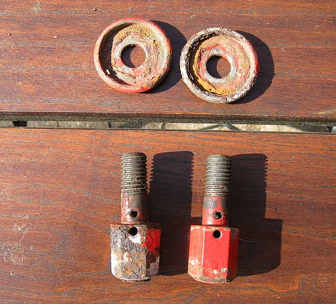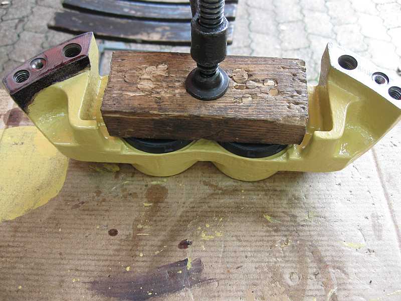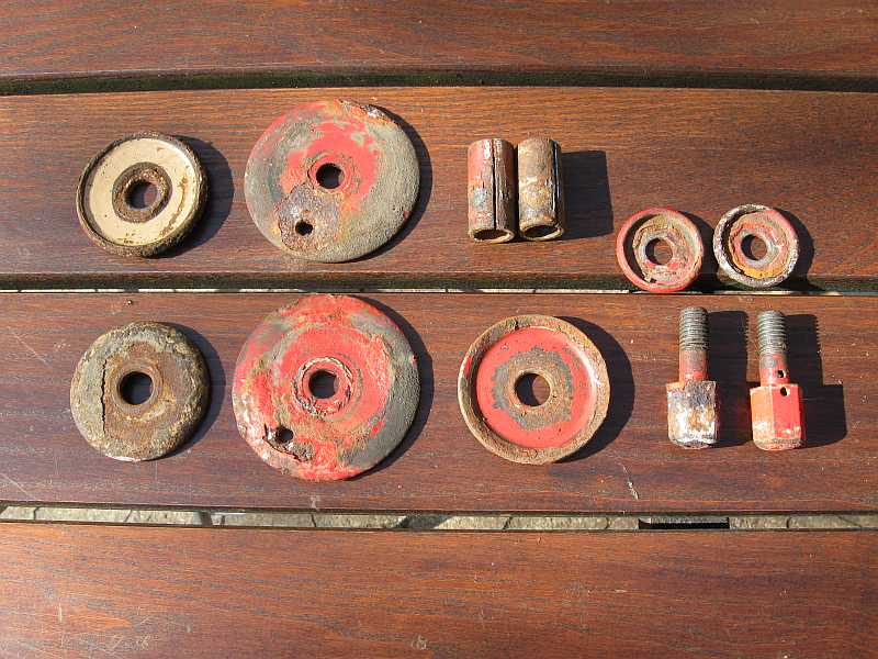 Die Kleinteile lassen sich in der Sandstrahlbox gut sandstrahlen. Der Gummipuffer ist mit einer durchbohrten Schraube, einer Druckplatte (2. Bild) und einem Abstandsring befestigt. Den Gummipuffer kann man mit einem Gummipflegemittel (zugleich Rostlöser) reinigen, siehe Einbau des Gummipuffers. |