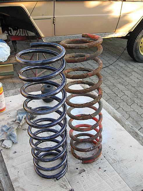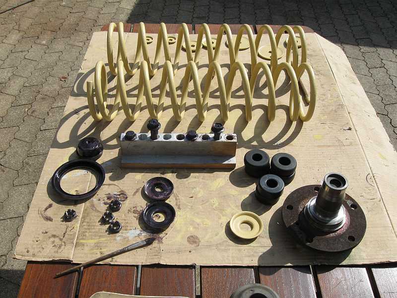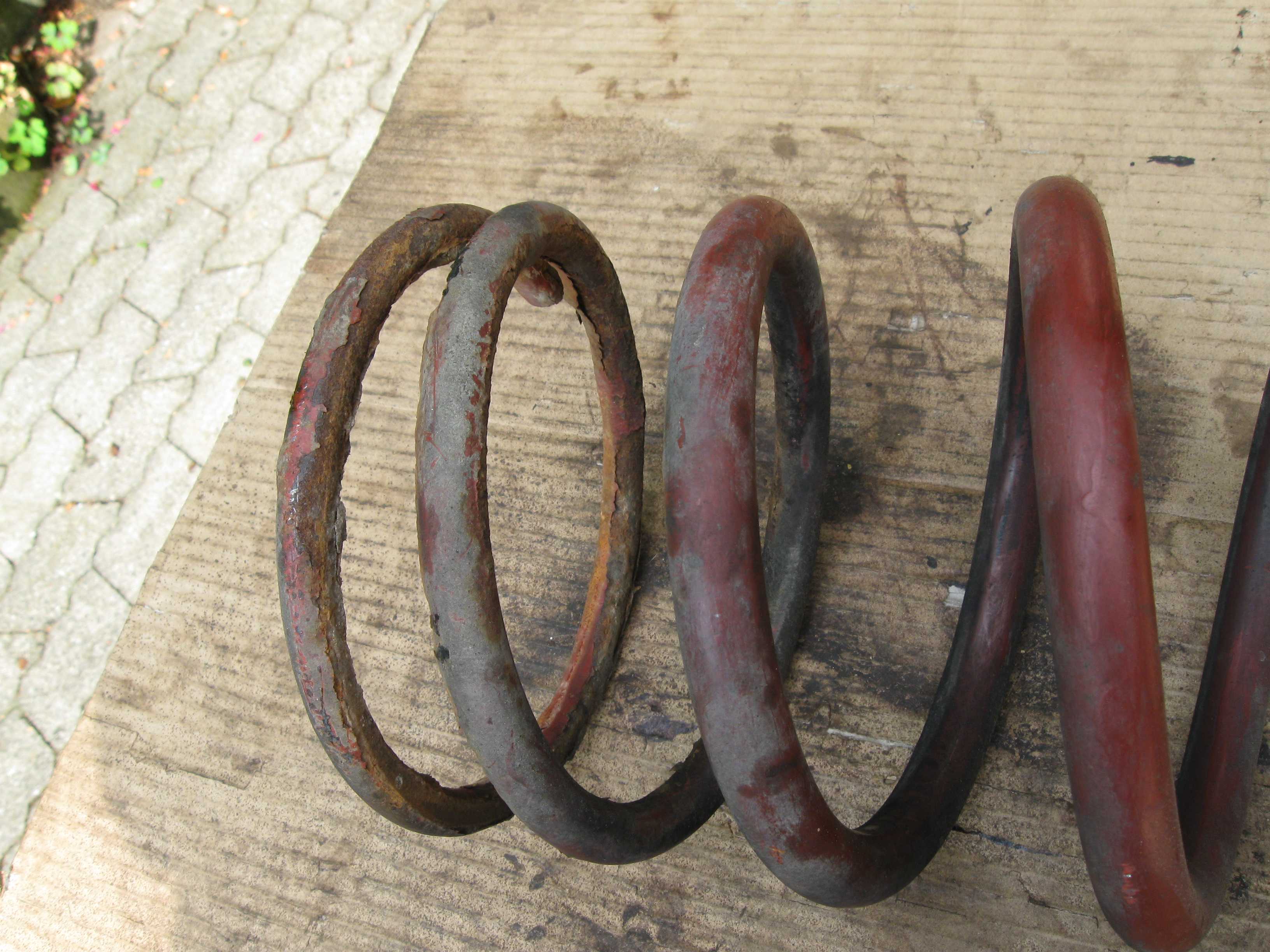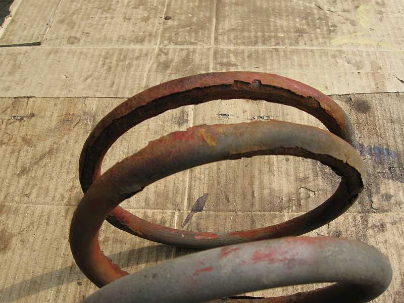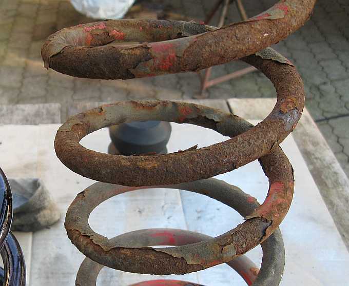 | Beim Entrosten zeigt sich auch, dass ich 1987 schon mal neue Federn vorne einbaute: A4603210204 gelb mit Jahreszahl (87),siehe Federtabelle. |