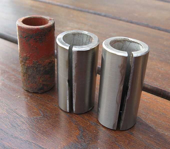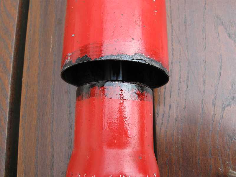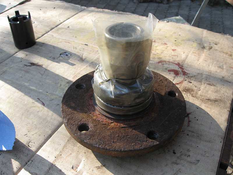 Da der untere Rand der Blechhülle verrostet ist, wird er einfach weggeschnitten. Nun kann man auch besser den inneren Rand etwa 10 cm tief mit Brunox behandeln. Der untere Teil wird sandgestrahlt und wie üblich lackiert. siehe auch tipp49.htm#b3. |