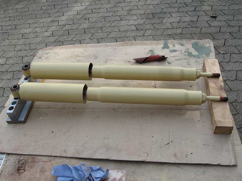 Die chemische Rostbehandlung erfolgt wieder mit Brunox. Nach einem Tag dann anschleifen, mit Mipa Rostschutzgrund grundieren und mit RAL 1012 sandgelb streichen. |