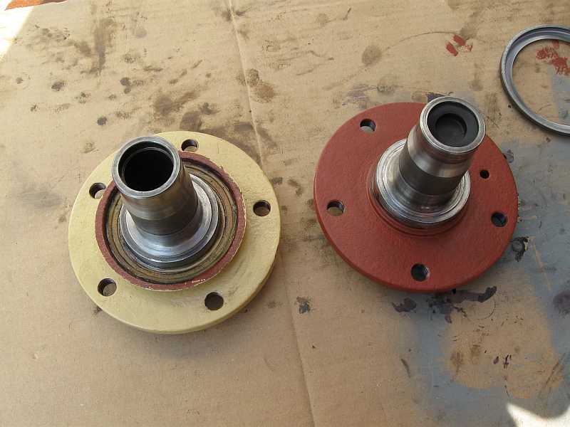 Die Achsgehäuse werden mit Abweisringen A4603370315 ergänzt. Die Fettnippel zum Nachschmieren entfallen, da das Achsgehäuse nicht mehr mit Fett gefüllt wird (siehe hier). In die M10x1-Schraublöcher in den großen Sechskantschrauben (zum Fett nachfüllen) habe ich M10x1-Schrauben gedreht und abgeschnitten. |