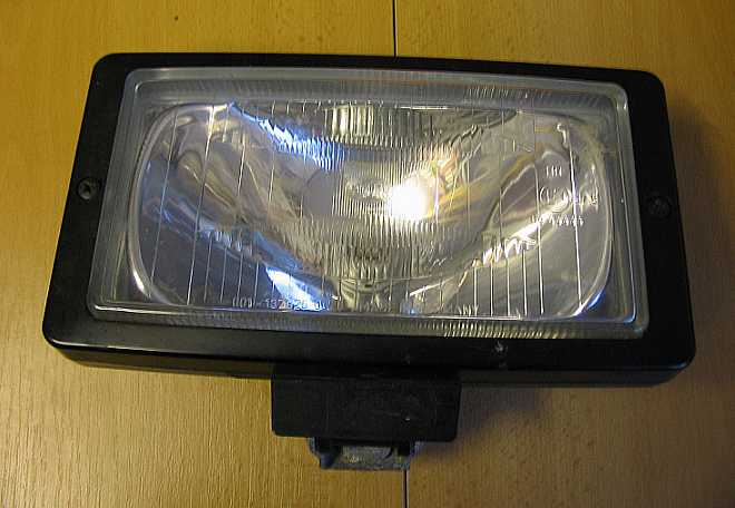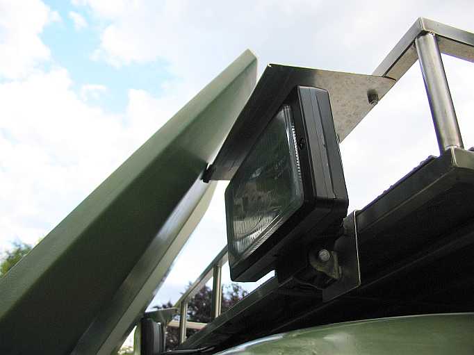 Am Dachgepäckträger können nun die Flutlichtscheinwerfer Jumbo 220 von Hella (Typ 1FE 006 300-04, Prüfzeichen E1 44444, 242 mm x 166 mm, Lichtaustritt 205 mm, H3-Halogenbirne) montiert werden (Danke, René).