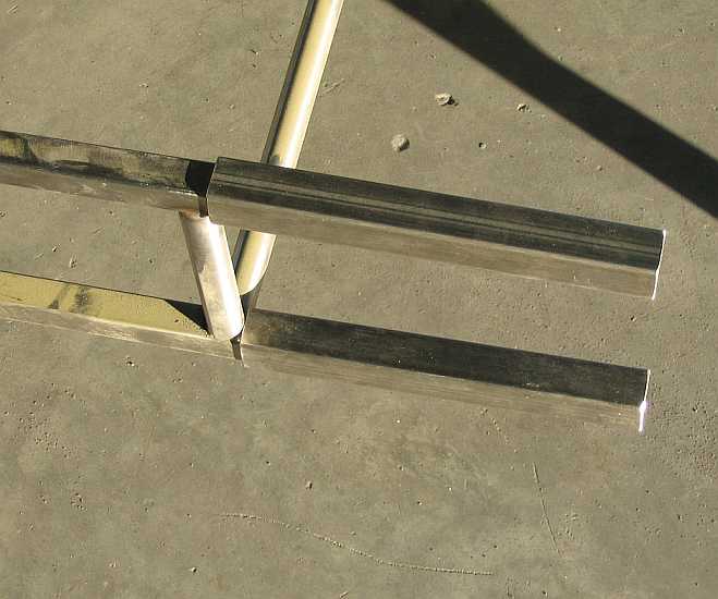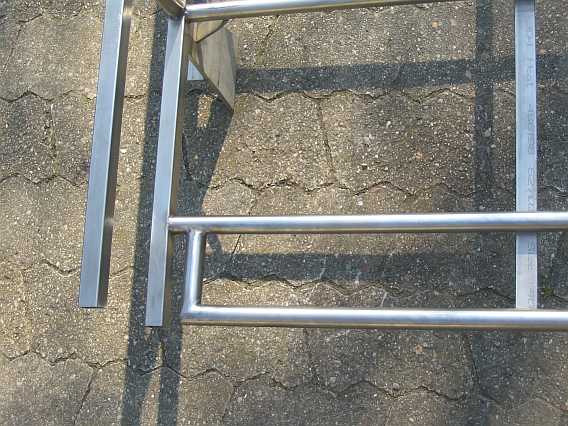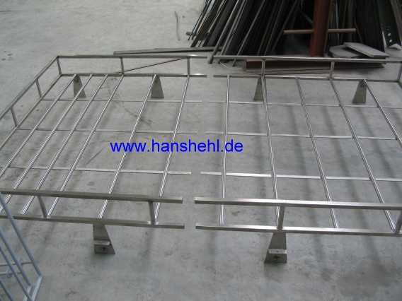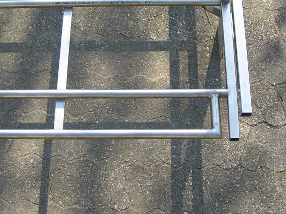 | Zur Stabilisierung des Trägerbodens an der abgetrennten Seite wurden zusätzliche Randstreben eingeschweißt. Die Enden der Seitenwandstreben mussten für die Rohrverbinder frei bleiben. | ![]() |