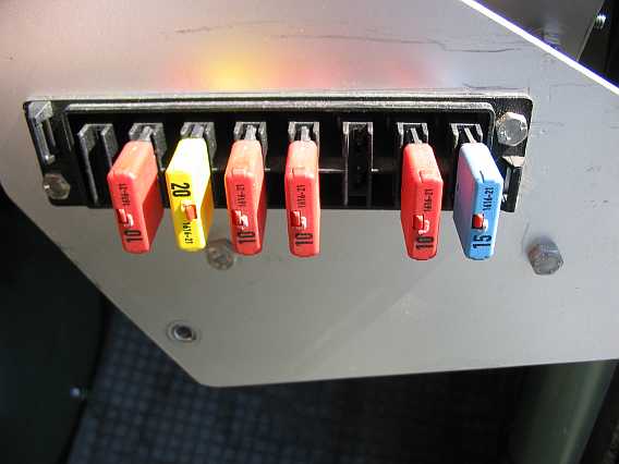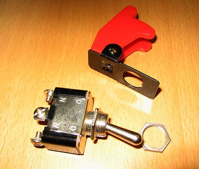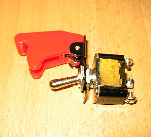 | Die beiden Scheinwerfer haben zusammen eine Stromaufnahme von 110 Watt, also 8,33A. Die Sicherheitsschalter von z.B. ISA-Racing (siehe Elektrozubehör) sind für 25 Amp ausgelegt (Bestell-Nr. 6010-1, 3,30 Euro inkl. MwSt., 12 V 25A, Wechselschalter, 12 mm Gewindehals). Dazu kommt die rote Schutzkappe Nr. 6012-0, 4,00 Euro inkl. MwSt.) | ![]() |