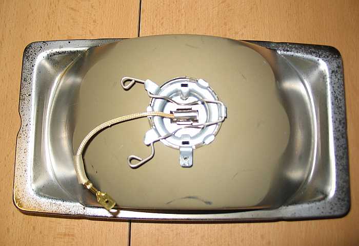 | Beim ersten Unwetter zeigt sich, dass der Scheinwerfer nicht wasserdicht ist, das Glas beschlägt innen. Also muss er oben abgedichtet werden. Mit Silikon habe ich den Plastikrahmen mit dem Schweinwerfereinsatz verklebt. Ein schwarzes Klebeband dichtet oben und an den Seiten den Spalt zwischen Gehäuse und Rahmen ab. Auch die Abdeckung über dem Schweinwerfer war notwendig. | ![]() |
