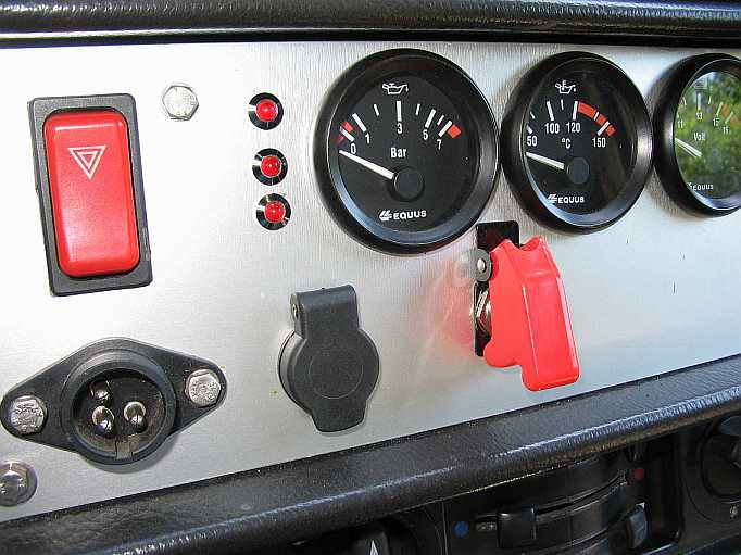| Eine grüne LED-Kontrolllampe benötigt ein 8 mm Loch im Armaturenbrett. Der Messinganschluss ist der Pluspol für 12V. | ![]() |
