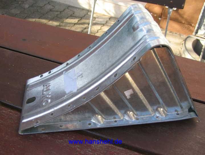 Bei Westfalia.de im Shop Landwirtschaft gibt es stabile und sehr preiswerte Unterlegekeile (Nr. 602391) aus verzinktem Stahlblech (1600 kg Radlast), da kann man gleich zwei nehmen. Es gibt auch noch einen stärkeren Unterlegkeil für 5 to Radlast. |