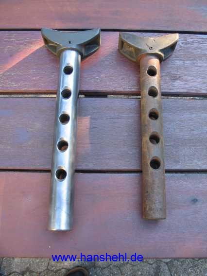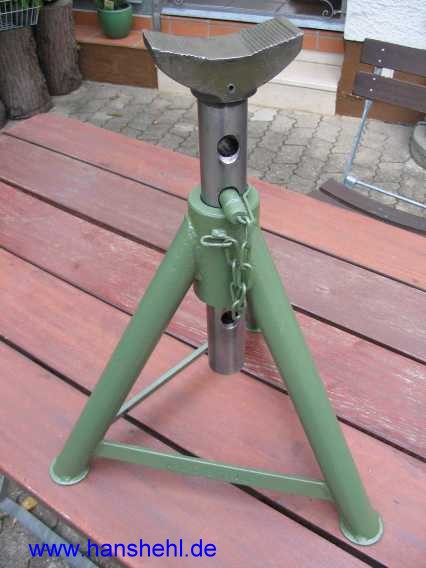 | Also Sandstrahlen siehe Tipp 2, Abschnitt 6, chemisch entrosten sieheTipp 2, Abschnitt 2, mit Drahtbürste blank polieren und auch grundieren und lackieren. Da war die Bundeswehrfarbe oliv Ral 6003 gerade recht. Rechts und links (4.Bild) stehen zwei Unterstellböcke für 1,5 to. | ![]() |