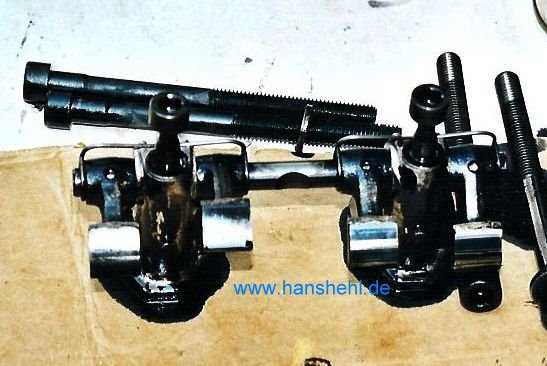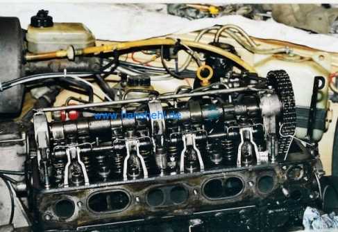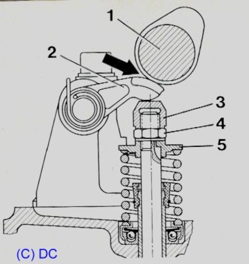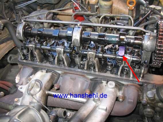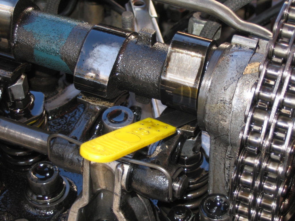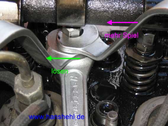Die Nockenwelle wird immer so gestellt, dass die Schwinghebel entlastet sind und der Nocken schräg nach oben zeigt. Man kann dann den Kipphebel von Hand etwas rauf und runter "kippen". Achtung: Dazu wird nicht die Nockenwelle selber, sondern nur an der Kurbelwelle (27 Nuß, kurze Verlängerung und Ratsche) in Drehrichtung des Motors (im Uhrzeigersinn) gedreht, sonst besteht Gefahr für die Spannschiene. |