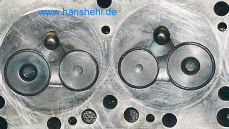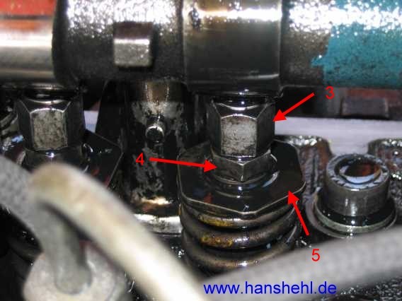Der Halteschlüssel (30mm) wird über den Sechskant des Ventilfedertellers (5) gelegt. Damit wird dieser mit dem Ventil gegen Verdrehen festgehalten. |