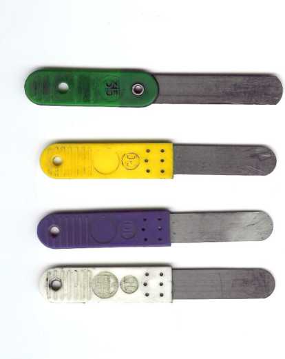 Das Blatt der Lehre muß sich stramm zwischen Kipphebel (2) und Nocken (1) durchziehen (siehe Pfeil) lassen. |