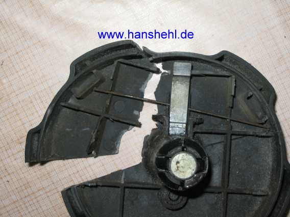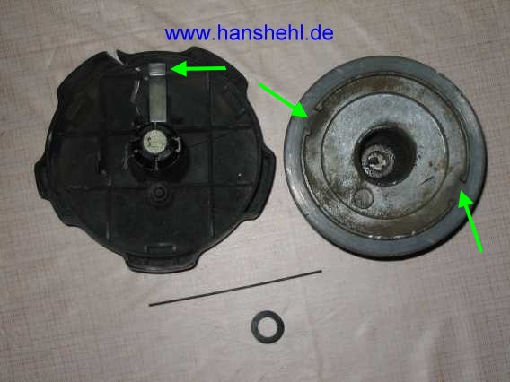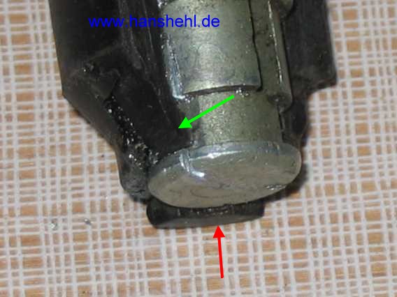 Der innere Aufbau des Tankdeckels war nicht dokumentiert. So könnte man ja die Schließung abändern (siehe Tipp Schließzylinder Lenkschloss und Tür). Von Steffen (viermalvier.de Forum Mercedes) erhielt ich am 26.02.2007 einen Tankdeckel zum Zerlegen (Vielen Dank!). Es ist ein Deckel ohne Entlüftungsbohrung (grüner Pfeil). |