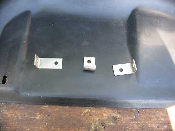 Die Befestigungswinkel muß man selber bauen und im Kotflügel und an der Karosserie anschrauben. Wie man die Winkel macht, ist egal, ich habe die Plastikschraubkappen vom 260 E (Innenkotflügel) genommen. Die passten dann auf dicke Sechskantblechschrauben, die ich an die Winkel mit dem Kopf schweißte. Es genügen 4 - 5 Winkel. Der Einbau war die beste Lösung gegen Rost. |