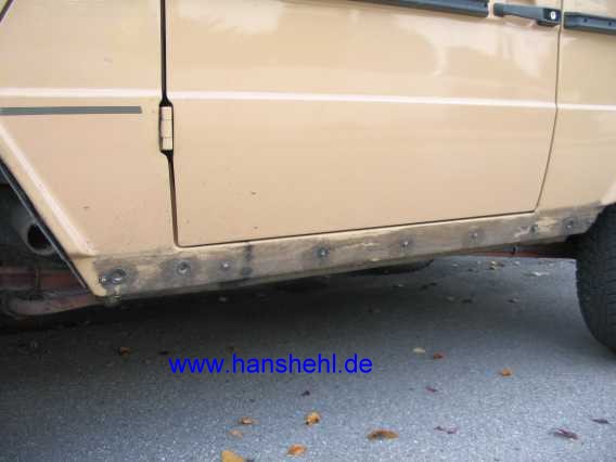 5 mm starkes Alu-Riffelblech (7 cm breit) als Seitenschutz anstelle der Gummileisten unter den Türen wird nun ab November 2006 ausprobiert. Beim G55AMG siehe Tipp 59, Abschnitt 3, sind die Bleche schon dran . |