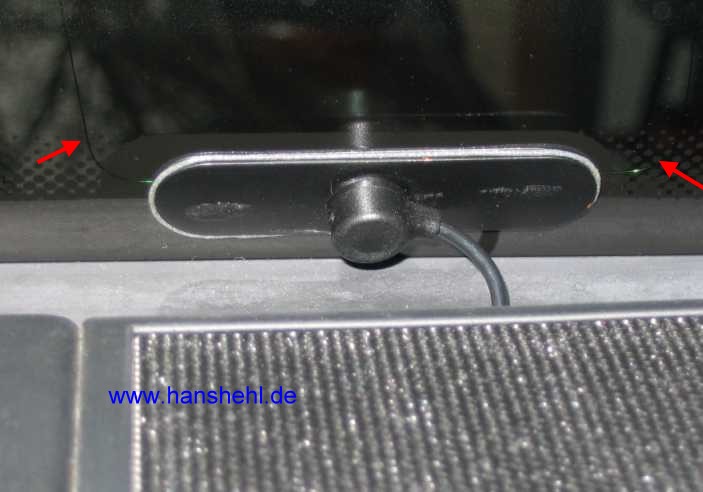 mit zwei durchsichtigen Klebepads auf die Glasscheibe geklebt. Ich habe die Platte von der alten Windschutzscheibe mal abgetrennt. |