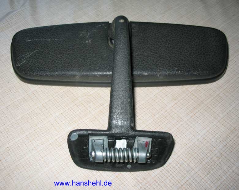 Seit 1979 ist bis 2006 die Befestigung des Innenspiegels (Bilder 240GD) gleich geblieben: Eine starke Feder drückt die zwei Bolzen nach außen in die Halterung, siehe Bild vom 240GD (10/1979). Etwas Fett an den seitlichen Bolzen und am Rahmen erleichtert die Montage. |