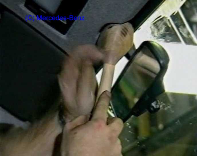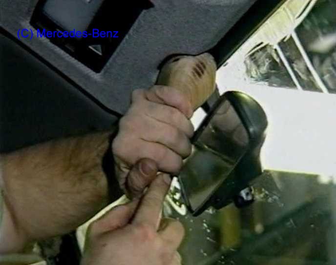 Innenspiegel ausbauen- 460/463: (AR68.40-P-0001GM) ![]() Der Innenspiegel kann mit einer kräftigen hebelartigen Bewegung am Spiegelfuß von der Scheibe weg nach unten aus seiner Halterung gezogen werden. Damit man aber an die Schraubanschlüsse der Kabel für die Scheibenheizung kommt, müssen der Spiegelhalterrahmen, die Dachbedieneinheit, die Sonnenblenden und die Haltegriffe ausgebaut werden, davon steht im WIS aber nichts. |
