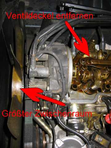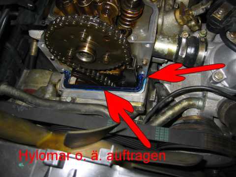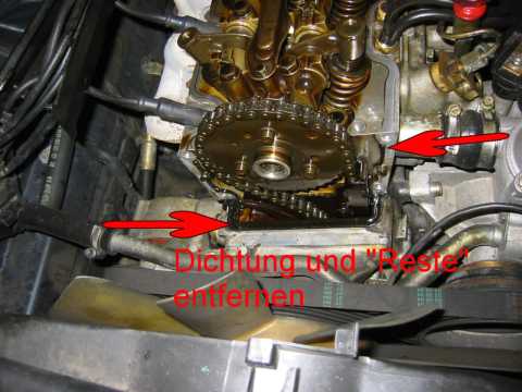 Mit 4mm "Spezialimbus" untere Schraube lösen. (Bild) (Schraube kann nicht herausfallen wenn locker) Obere 2 Schrauben öffnen und Verteilerdeckel abnehmen. Die 3 Schrauben am Verteilerfinger lösen und Finger abziehen (ggf. erneuern da abgebrannt) (Bild) Mit 30er Torx zentrale Schraube lösen und Verteilerfingerhalterung abziehen. (soll manchmal schwergängig sein, dann ggf. mit 3 Schrauben "abdrücken" und vorsichtig mit Hammer lockern) Gelbe / orange Scheibe abnehmen reinigen und O-Ring Dichtung erneuern (i. d. R. "steinhart"). Die vier M10 Schrauben lösen und Deckel vorsichtig mit Gummihammer lösen. Schraube unten rechts in Fahrtrichtung lässt sich wegen der Kühlerwasserleitung nicht entfernen mit Deckel zusammen herausnehmen. Deckel reinigen und insbesondere die alten (Silikon-) Dichtungsreste sorgfältig entfernen. Alten Simmerring (Nockenwelle) entfernen. Alte Gummilippe entfernen und ebenfalls sehr sorgfältig die Dichtungsreste entfernen (Oberfläche nicht zerkratzen) Staubsauger verwenden damit keine Teile in den Kasten der Steuerkette fallen. Dichtungslippe mit Hylomar bestreichen und einsetzen. Alle übrigen Dichtflächen insbesondere die Ecken ausreichend mit Hylomar bestreichen. Deckel mit eingesetzter Schraube unten rechts mit Gefühl einpassen (Dichtlippe nicht beschädigen oder verschieben). Die 4 Schrauben gut anziehen. (Dichtmasse quillt leicht nach außen). Simmerring mit etwas Öl bestreichen und mit Hilfe des Daumennagels über die Welle schieben. Mit Gefühl und einer großen Nuss weiter über die Welle schieben bis plan mit der Oberfläche des Deckels. (Achtung nicht zu weit schieben da kein Anschlag). Gelb / orange Scheibe mit neuer O-Ringdichtung einlegen. Verteilerfingerhalterung mit zentraler Torx Schraube befestigen. Verteilerfinger (neu) mit den 3 Schrauben befestigen. Verteilerdeckel (neu) mit Schutzkappe mit den 3 Schrauben einbauen. Zündkabel gem. Nummerierung aufstecken. Ventildeckel aufsetzen und festschrauben, Unterdruckleitungen nicht vergessen. Zündverteiler Abdeckung montieren,Motor starten und Probfahrt machen, "Bermudadreieck" auf Dichtheit prüfen. Anmerkung: Mit neuem Verteiler / Finger wesentlich ruhigerer Leerlauf. |