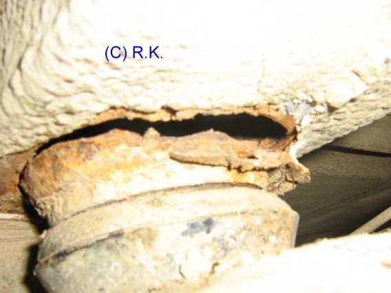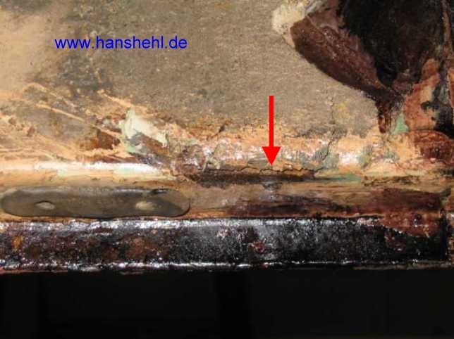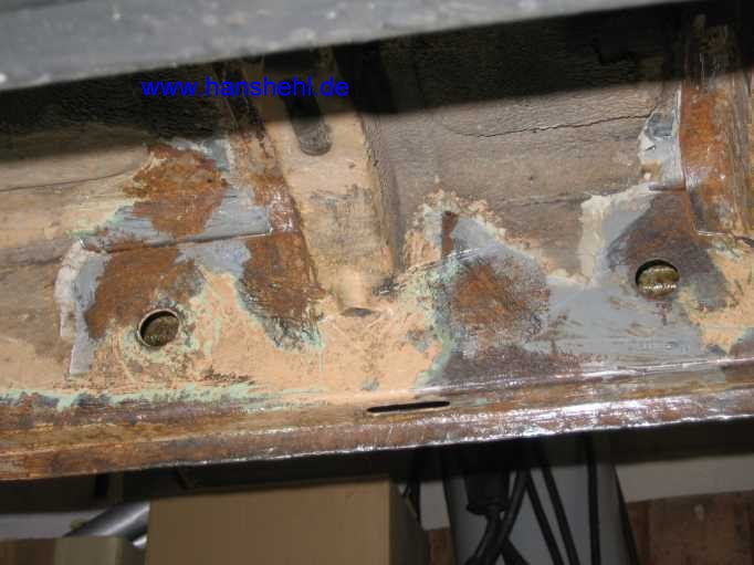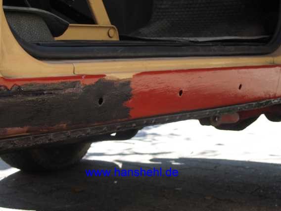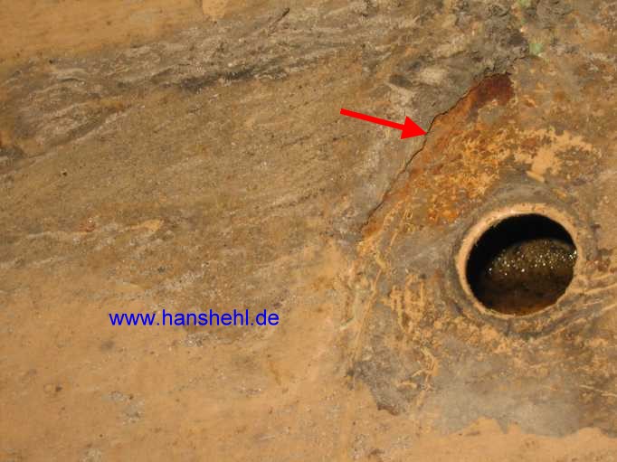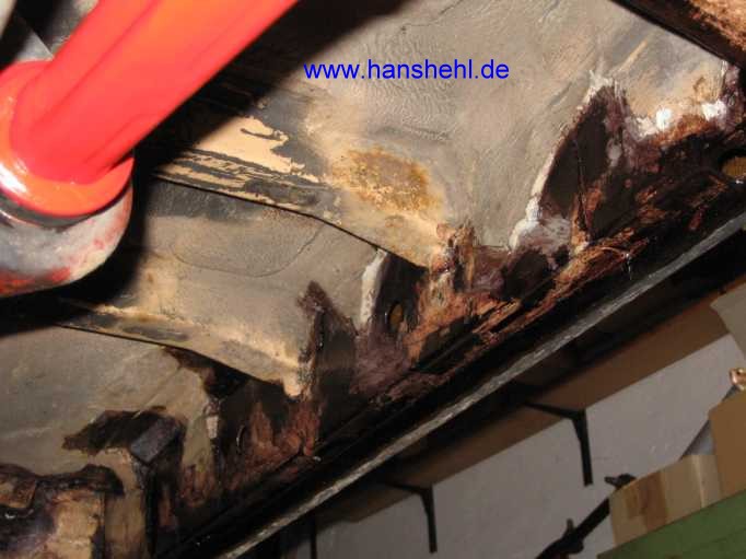 Schaut man sich nach einigen Jahren mal wieder die Unterseite genauer an, entdeckt man braune Stellen im originalen am Unterbodenschutz. Mit einem stabilen Messer oder mit einem alten Stemmeisen legt man die Rostfläche frei. Ursache ist die Versprödung und Rissbildung des Kunststoffmaterials. Darunter rostet das Blech weg. Am Besten entfernt man den alten Belag ganz. |