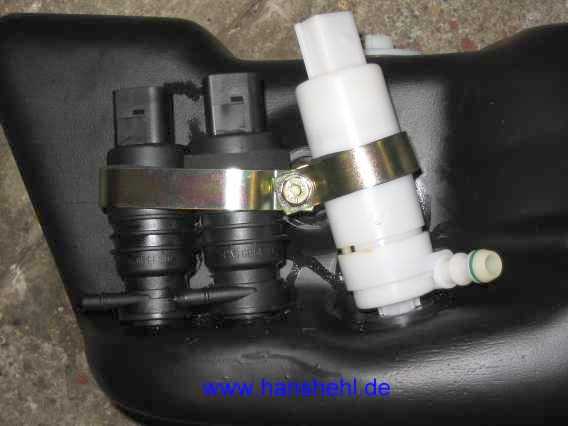 Die weiße Pumpe M5/2 mit weißem Stecker bedient die Scheinwerferreinigungsanlage (SRA). Schaltplan: PE82.15-P-2000-99GA, Legende: PE82.15-P-2000-60GA) Die Pumpe wird vom Steuergerät SAM (vorne) N10/1 direkt mit + 12V angesteuert (rot/grau und braun, 1,5 mm2). Eingeschaltet wird sie mit dem Taster S1s7 im Lichtschaltermodul S1 (links neben dem Lenkrad, das direkt mit dem SAM vorne N10/1 verbunden ist. Es gibt keine Sicherung (ist aber elektronisch abgesichert). |