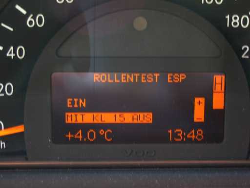 | Die Einstellung "ROLLENTEST EIN" = "ESP aus" bleibt auch nach dem Ausschalten des Motors bestehen. Der Schalter ESP OFF in der Mittelkonsole schaltet das ESP nur bis 60 km/h ab. ETS bleibt dabei eingeschaltet. Im Test auf einer vereisten Fläche (Arjeplog) zeigt sich, dass bei "ROLLENTEST EIN" das ETS sich doch bei durchdrehendem Rad zuschaltet (blinkendes Warnfeld). |
