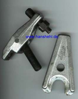 | Zum Ausbau der Lenkstange kann z.B. problemlos der kleine Abzieher Nr. 779 von Hazet (etwa 70 Euro inkl.) verwendet werden. Er ist robust, es gibt notfalls einen Reparatursatz. Den Abscherbolzen gibt es einzeln als Zylinderpassstift, siehe Tipp Werkzeug. Allerdings ist der Abzieher für die größeren Lenkstangen beim 463 zu klein, da ist der Abzieher 779-2 geeignet. | ![]() |