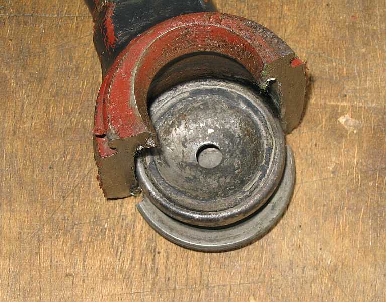 Da habe ich mal ein altes Gelenkstück aufgeschnitten! Es bestand aus 8 Teilen. Am rostigen Kugelzapfen sieht man, dass die Schmierung nicht über Jahrzehnte ausreicht, besonders wenn anscheinend die Staubmanschette einen Riß hatte. In den Bodendeckel könnte man einen Schmiernippel einbauen, so wie es früher mal war! siehe auch Lenkstangenkopf 280GE. |