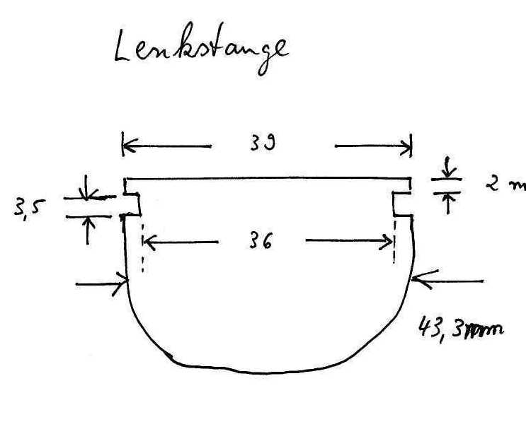 | Die Lenkstange allein ohne die Gelenkstücke ist 95 cm lang, mit den Gelenkstücken ergibt sich eine Gesamtlänge (Aussenkanten) von 109,4 cm. |