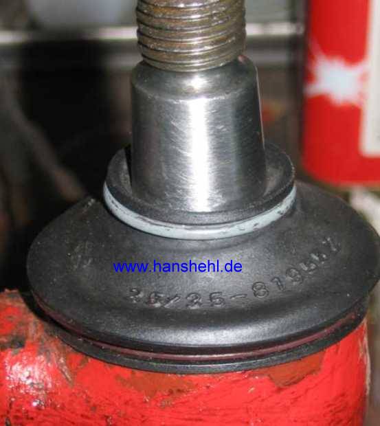 25/35, etwa 7,50 Euro ohne. Alle Staubschutz-Kappen, also mit Innendurchmesser 34, 37, 39 und 44 mm gibt es bei Fa. Kindermann-Nutzfahrzeuge, Suchwort = Manschette (Tipp von "Thomas v. Bodensee", 4x4-Forum). Der kleine Spannring kommt in die Nut im oberen Kappenteil und die Manschette wird über den Kegel des Gelenkstückes geschoben. Der untere Gummirand greift in die Nut des Gelenkstückes ein und wird mit dem großen Spannring gehalten. |