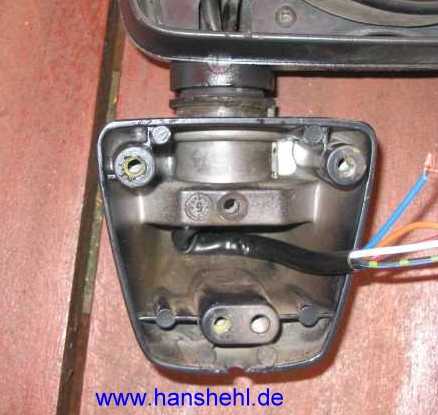 Auch die elektrische Verstellung (Schalter vom Pkw, roter Pfeil im Bild) und Spiegelheizung (Relais mit Schalter) lassen sich nachträglich einbauen. Der Schalter wirkt wie ein Joy-Stick für die horizontale und vertikale Verstellung des Spiegels. Durch Drehen des Knopfes wird zwischen linkem und rechtem Spiegel umgeschaltet (Hinweis von DaPo, viermalvier-Forum). Eigentlich könnte man den Schalter mit Relais für die Spiegelheizung weglassen und diese über eine Sicherung direkt an Kl. 15 anschliessen (DC-Lösung). Das beheizte Spiegelglas wird durch einen Temperaturschalter gesteuert, der ab 25 Grad öffnet und so die Spiegelheizung ausschaltet. Die Heizfolie hat einen Widerstand von etwa 4,7 Ohm, da fließen auch nur max. 2,8 A bei 13 V. |