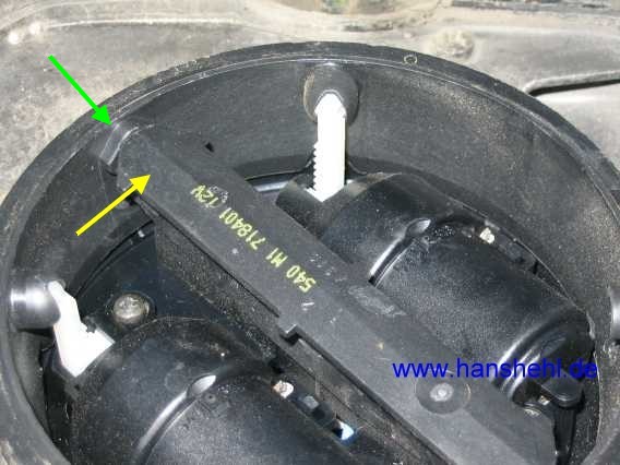 Nach Lösen der Torx-Schraube (TX25, grüner Pfeil) kann der Spiegelfuß (notfalls mit Plastikhammer vorsichtig nachhelfen) vom Unterteil abgezogen werden. |